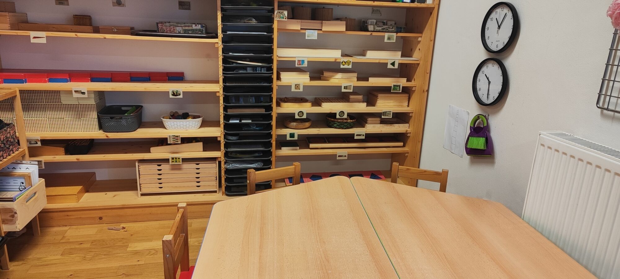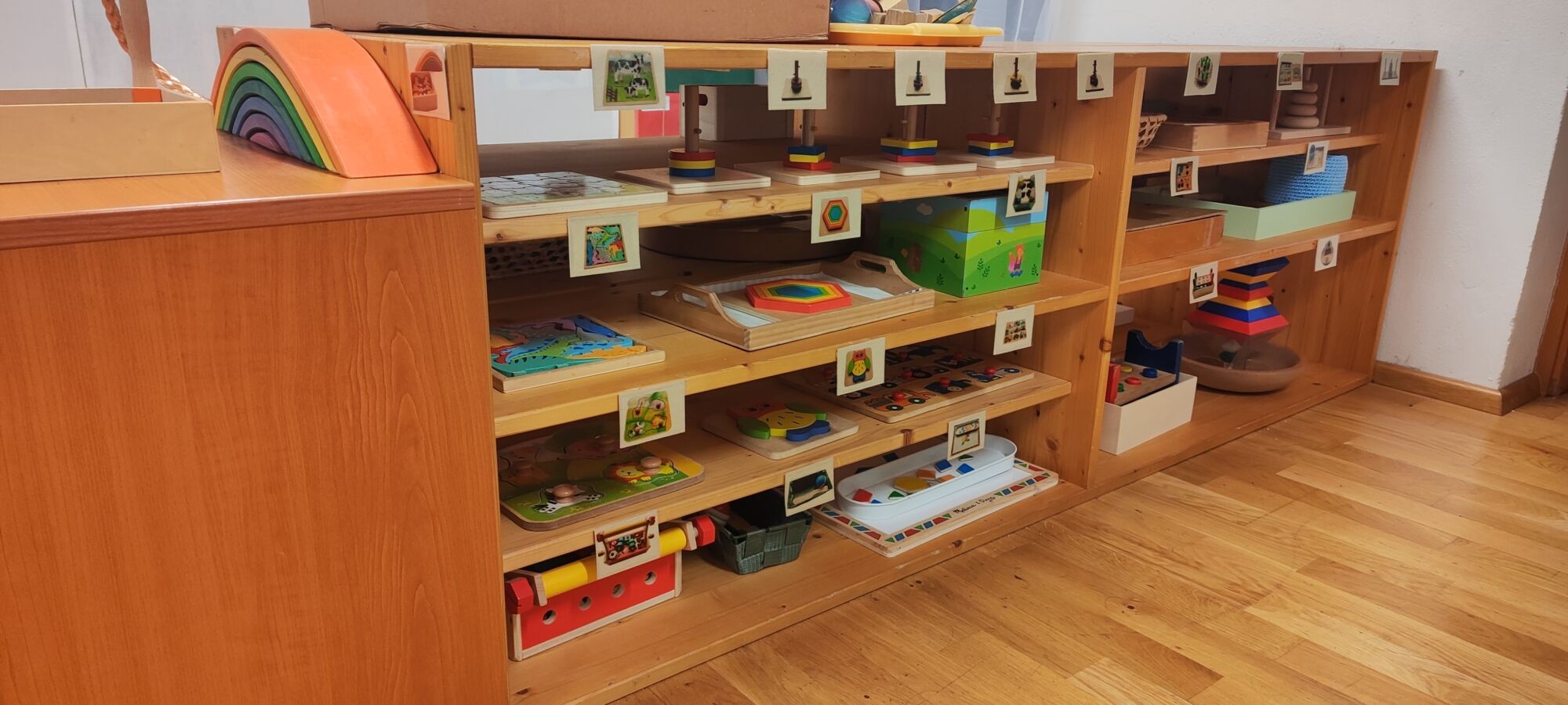 Pomůcky jsou označené štítky, aby dítě vědělo, kam patří. Kobereček mu dává jeho vlastní prostor, kde se učí soustředění a samostatnosti.
